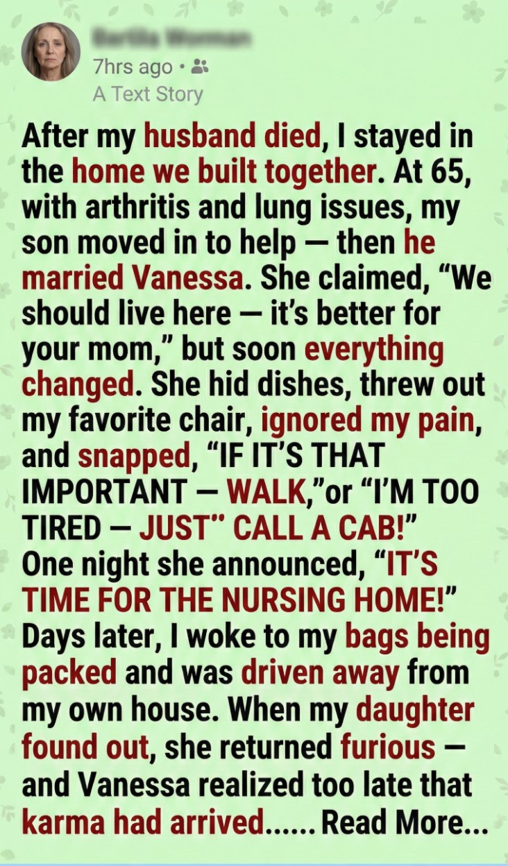 I never imagined my son and his wife would be the ones to turn me out of the home filled with my husband’s memory. But what happened next proved that …