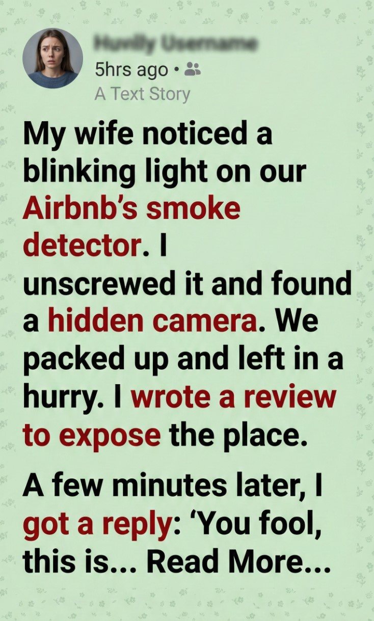 While staying at an Airbnb, the narrator’s wife noticed a faint, blinking light on the smoke detector. It seemed insignificant at first, but curiosity—and an underlying unease—prompted him to climb …