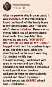I sat back, tears streaming down my face—not of sadness, but of relief. My parents had been looking out for me from beyond the grave. They knew I couldn’t survive living with a woman who hated me, so they ensured I wouldn’t have to.