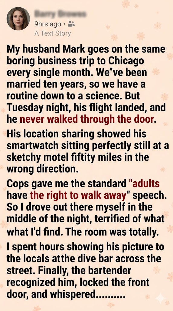 “He’s a ghost, lady,” the bartender said grimly. “He spent three days every month in that motel across the street, watching the industrial shipping yard down by the river. Said he was tying up loose ends. Guess the ends tied him up instead.”