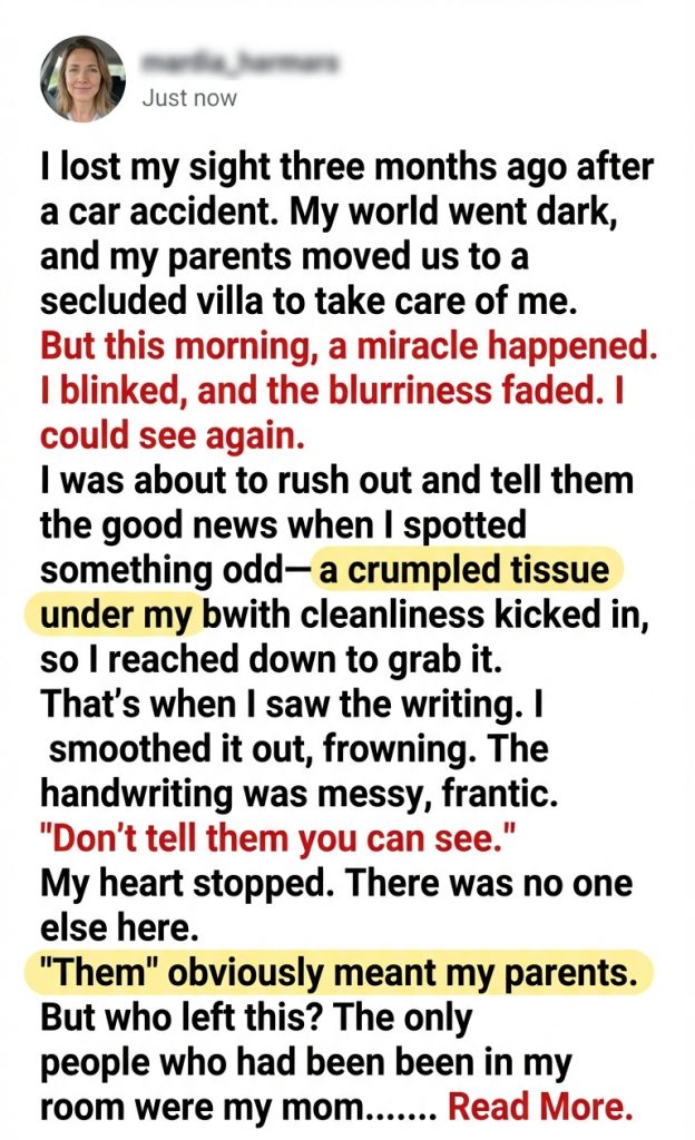 “I lost my sight three months ago after a car accident. My world went dark, and my parents moved us to a secluded villa to take care of me. But this morning, a miracle happened. I blinked, and the blurriness faded. I could see again.
