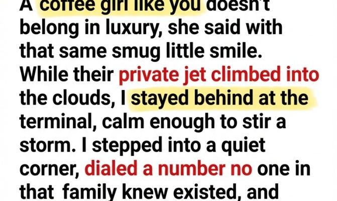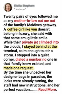 “Twenty pairs of eyes followed me as my mother-in-law cut me out of the family’s Maldives getaway. A coffee girl like you doesn’t belong in luxury,” she said with that same smug little smile. While their private jet climbed into the clouds, I stayed behind at the terminal, calm enough to stir a storm. I stepped into a quiet corner, dialed a number no one in that family knew existed, and made one request. By the time she unpacked her designer bags in paradise, the locks were already turning, the staff had new instructions, and her perfect vacation was about to become a nightmare with my name written between the lines. Some thrones become cages.