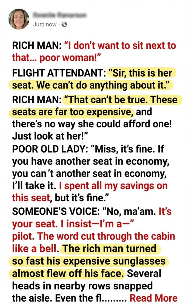 The pilot turned back to the old lady, softer now. “When I finally found her again,” he said, “I bought her this seat. Not because she needs charity. Because she deserves comfort. Because she earned it.”