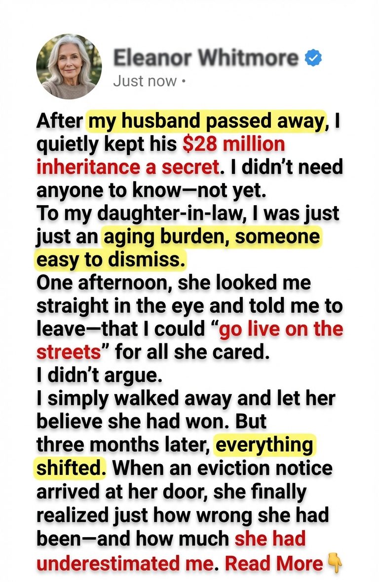 After my husband passed away, I quietly kept his $28 million inheritance a secret. I didn’t need anyone to know—not yet. To my daughter-in-law, I was just an aging burden, someone easy to dismiss. One afternoon, she looked me straight in the eye and told me to leave—that I could “go live on the streets” for all she cared. I didn’t argue. I simply walked away and let her believe she had won. But three months later, everything shifted. When an eviction notice arrived at her door, she finally realized just how wrong she had been—and how much she had underestimated me.
