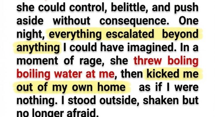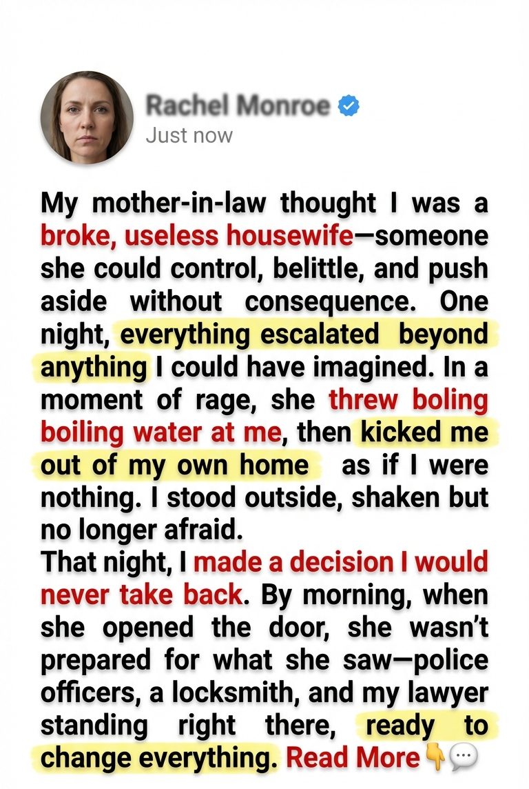 My mother-in-law thought I was a broke, useless housewife—someone she could control, belittle, and push aside without consequence. One night, everything escalated beyond anything I could have imagined. In a moment of rage, she threw boiling water at me, then kicked me out of my own home as if I were nothing. I stood outside, shaken but no longer afraid. That night, I made a decision I would never take back. By morning, when she opened the door, she wasn’t prepared for what she saw—police officers, a locksmith, and my lawyer standing right there, ready to change everything.