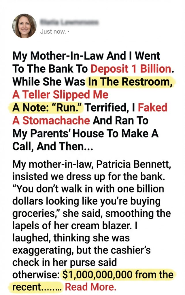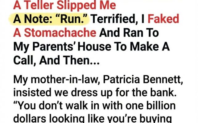 My Mother-In-Law And I Went To The Bank To Deposit 1 Billion. While She Was In The Restroom, A Teller Slipped Me A Note: “Run.” Terrified, I Faked A Stomachache And Ran To My Parents’ House To Make A Call, And Then…