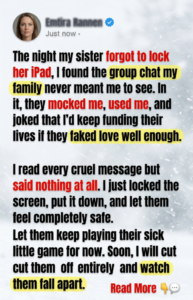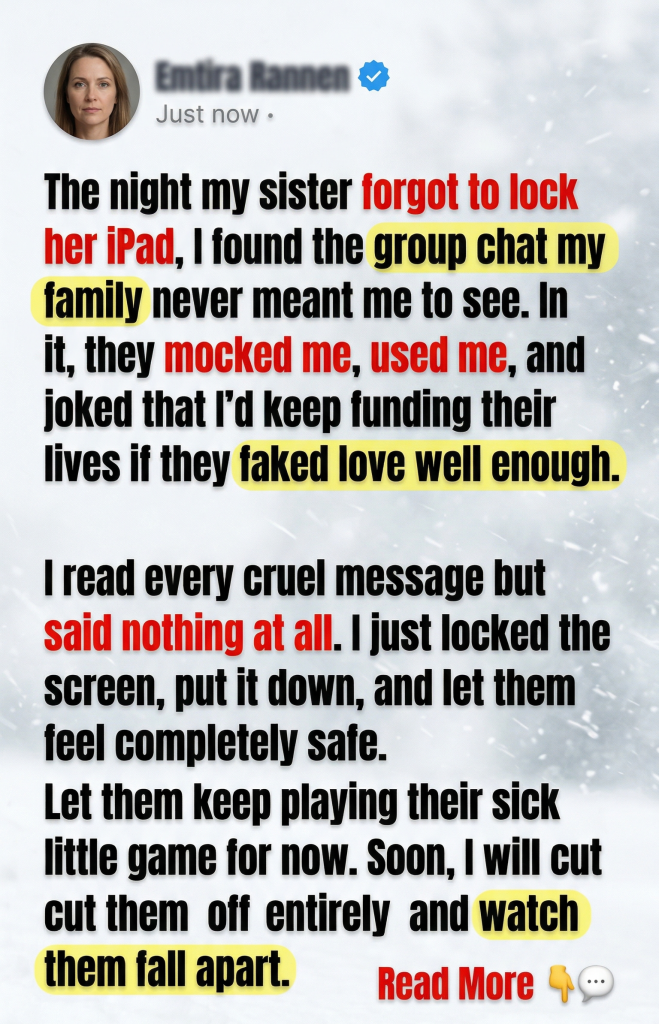 The night my sister forgot to lock her iPad, I found the group chat my family never meant me to see. In it, they mocked me, used me, and joked that I’d keep funding their lives if they faked love well enough. I said nothing. I let them feel safe. At 8:12 on a Tuesday night, I was standing in my sister Lauren’s kitchen in Columbus, Ohio, holding her unlocked iPad in both hands while a pot of boxed macaroni boiled over on the stove. I had only picked it up because it kept buzzing relentlessly.