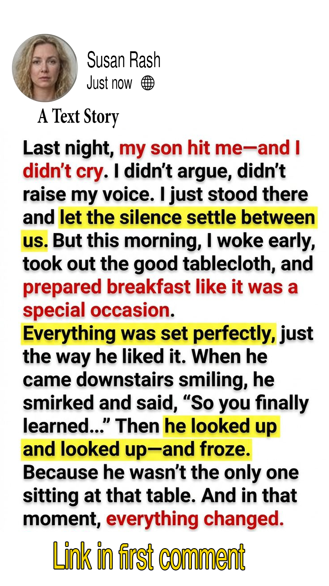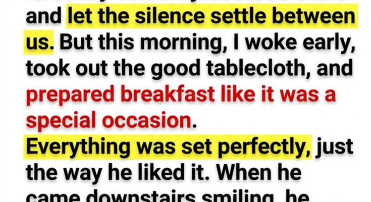 Last night, my son hit me—and I didn’t cry. I didn’t argue, didn’t raise my voice. I just stood there and let the silence settle between us. But this morning, I woke early, took out the good tablecloth, and prepared breakfast like it was a special occasion. Everything was set perfectly, just the way he liked it. When he came downstairs smiling, he smirked and said, “So you finally learned…” Then he looked up—and froze. Because he wasn’t the only one sitting at that table. And in that moment, everything changed.