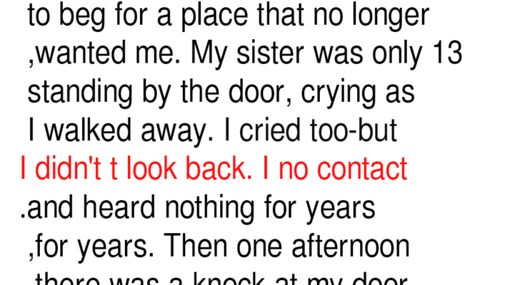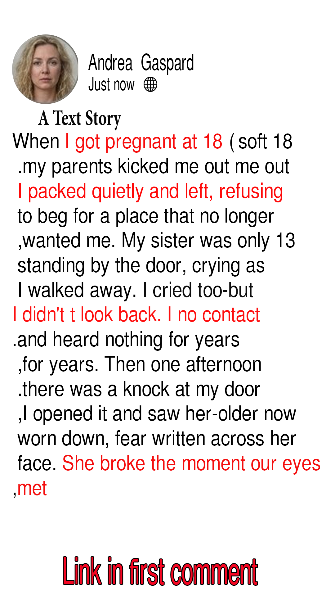 When I got pregnant at 18, my parents kicked me out. I packed quietly and left, refusing to beg for a place that no longer wanted me. My sister was only 13, standing by the door, crying as I walked away. I cried too—but I didn’t look back. I went no contact and heard nothing for years. Then one afternoon, there was a knock at my door. I opened it and saw her—older now, worn down, fear written across her face. She broke the moment our eyes met, tears spilling as she grabbed onto me. “Mom and Dad…” she choked out, her voice trembling. “They took everything from me, and now they are trying to force me to take the fall for their crimes.”