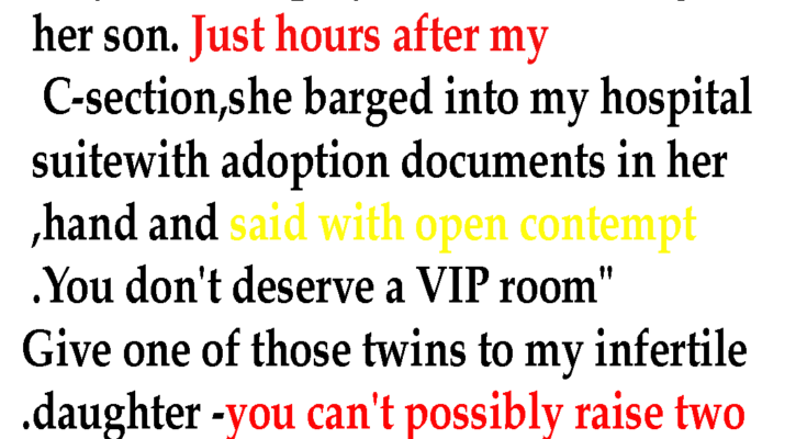 I Never Told My Mother-in-Law I Was a Federal Judge. In her eyes, I was only an unemployed woman living off her son. Just hours after my C-section, she barged into my hospital suite with adoption documents in her hand and said with open contempt, “You don’t deserve a VIP room. Give one of those twins to my infertile daughter — you can’t possibly raise two.” I hit the emergency button beside my bed. When security rushed in, she began shouting that I was unstable. They were seconds from restraining me… until the chief looked at my face and suddenly froze in recognition.