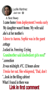 I came home from deployment 3 weeks early. My daughter wasn’t home. My wife said she’s at her mother’s. I drove to Aurora. Sophie was in the guest cottage. Locked in. Freezing. Crying. “Grandmother said disobedient girls need correction.” It was midnight. 4°C. 12 hours alone. I broke her out. She whispered, “Dad, don’t look in the filing cabinet…” What I found in there was…