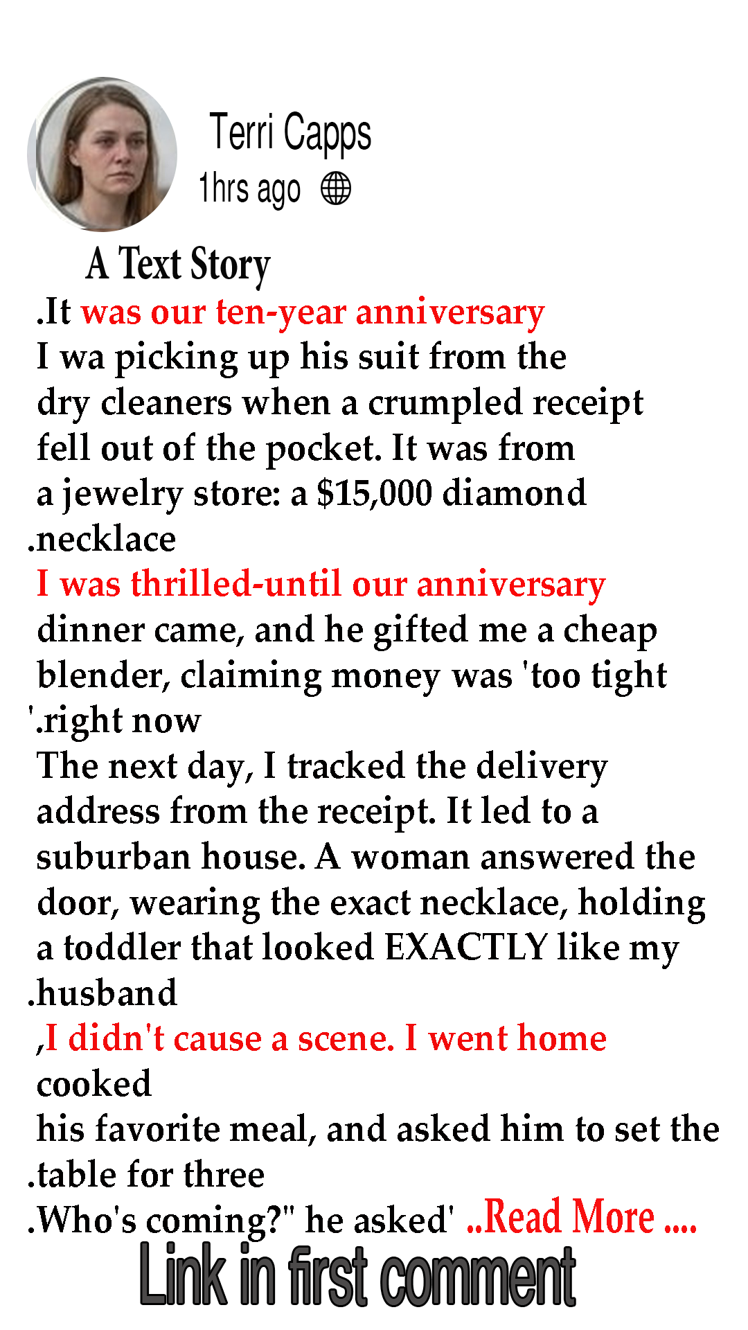 The woman gasped, taking a sharp step back. Her hand flew up to clutch the diamond necklace. âWife? He told me⌠he said his divorce was finalized three years ago. He told me he was just waiting to sell this house.â