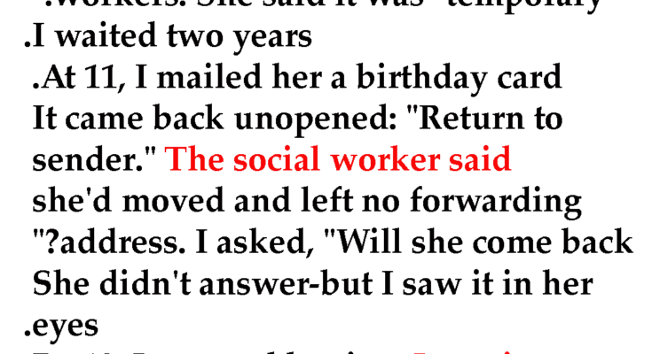 At 11, I mailed her a birthday card. It came back unopened: “Return to sender.” The social worker said she’d moved and left no forwarding address. I asked, “Will she come back?” She didn’t answer—but I saw it in her eyes.