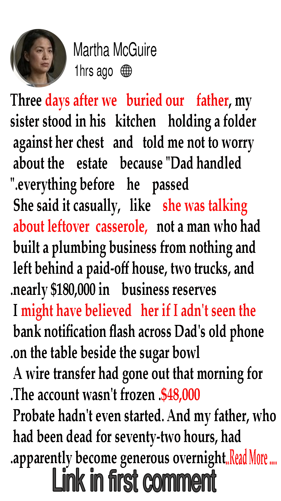 Three days after we buried our father, my sister stood in his kitchen holding a folder against her chest and told me not to worry about the estate because “Dad handled everything before he passed.” She said it casually, like she was talking about leftover casserole, not a man who had built a plumbing business from nothing and left behind a paid-off house, two trucks, and nearly $180,000 in business reserves. I might have believed her if I hadn’t seen the bank notification flash across Dad’s old phone on the table beside the sugar bowl. A wire transfer had gone out that morning for $48,000. The account wasn’t frozen. Probate hadn’t even started. And my father, who had been dead for seventy-two hours, had apparently become generous overnight.
