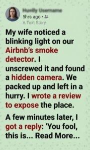 While staying at an Airbnb, the narrator’s wife noticed a faint, blinking light on the smoke detector. It seemed insignificant at first, but curiosity—and an underlying unease—prompted him to climb up and investigate. What he discovered made his heart pound: a tiny lens hidden inside the device, unmistakably a camera.