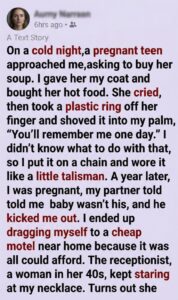 Her eyes filled with tears the moment she saw the plastic ring hanging from my chain. For a second, neither of us spoke—just stared, caught between disbelief and recognition.