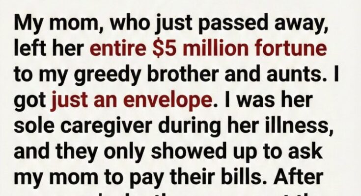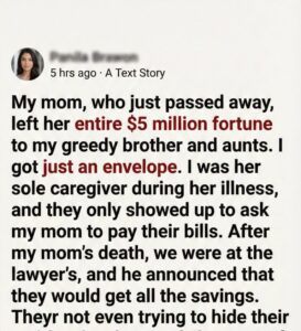 My breath hitched. A wave of nausea washed over me. Just this? After all these years? All the sacrifices, all the unspoken longing for her affection? My siblings exchanged uncomfortable glances. They knew our relationship had always been strained, distant. But this felt like a final, definitive declaration of my place in her heart: an afterthought, barely worth the paper this envelope was made from.